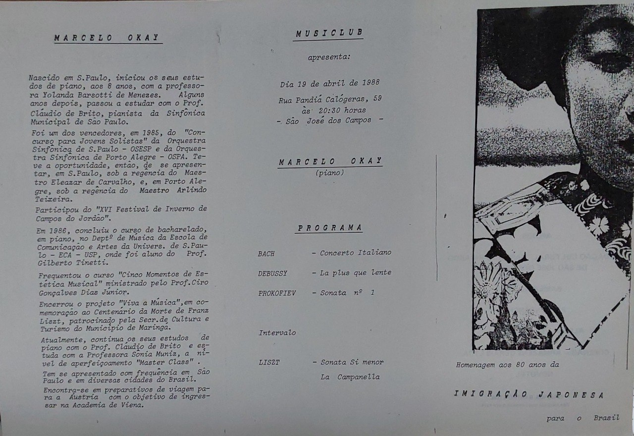 Marcelo Okay, pianista paulistano, venceu concursos da OSESP e OSPA em 1985, apresentou-se com maestros renomados e concluiu bacharelado na ECA-USP. Estudou com Gilberto Tinetti, Cláudio de Brito e Sônia Muniz. Atuou em festivais e concertos pelo Brasil e prepara-se para estudar na Academia de Viena. Em 19/04/1988, apresentou-se em São José dos Campos pelo Musiclub, em homenagem aos 80 anos da imigração japonesa.