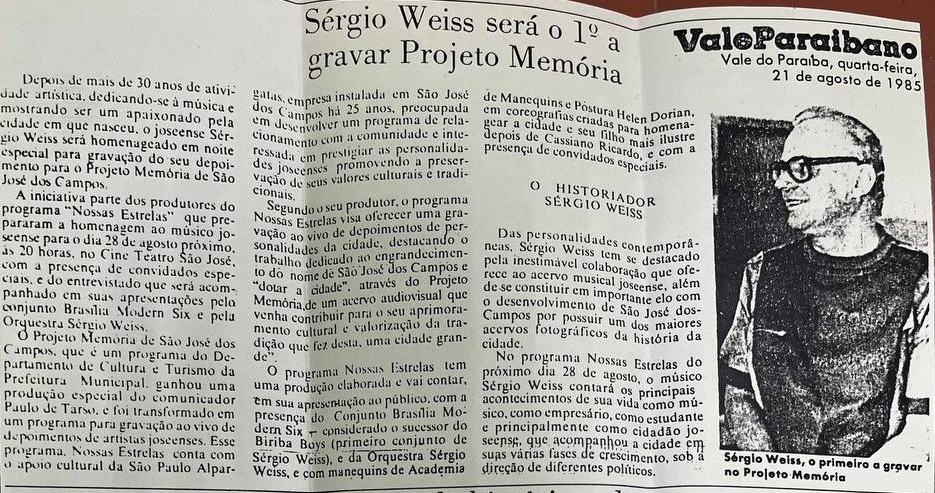 O músico Sérgio Weiss, com mais de 30 anos de carreira em São José dos Campos, seria o primeiro a ter seu depoimento gravado para o Projeto Memória. O programa, iniciativa do Departamento de Cultura e Turismo da Prefeitura e produzido por Paulo de Tarso, transformou-se em gravações ao vivo de artistas Joséenses. A homenagem a Weiss ocorreria no Cine Teatro São José, às 20h, com apresentações do conjunto Brasília Modern Six e da Orquestra Sérgio Weiss.