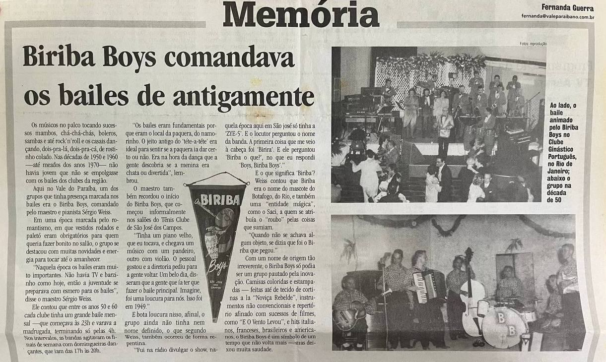 A reportagem "Memória" de Fernanda Guerra, no Jornal Valeparaíbano, destaca a era de ouro dos bailes em São José dos Campos nas décadas de 50 a 70, animados por grupos como o Biriba Boys, liderado pelo maestro Sérgio Weiss. Esses bailes, com repertório eclético e duração madrugada adentro, eram o principal evento social e local de paquera para a juventude, em uma época sem TV e barzinhos. Weiss conta o surgimento informal do Biriba Boys em 1949, que teve o nome dado por um locutor de rádio e inspirou-se no mascote do Botafogo e no folclore do Saci.