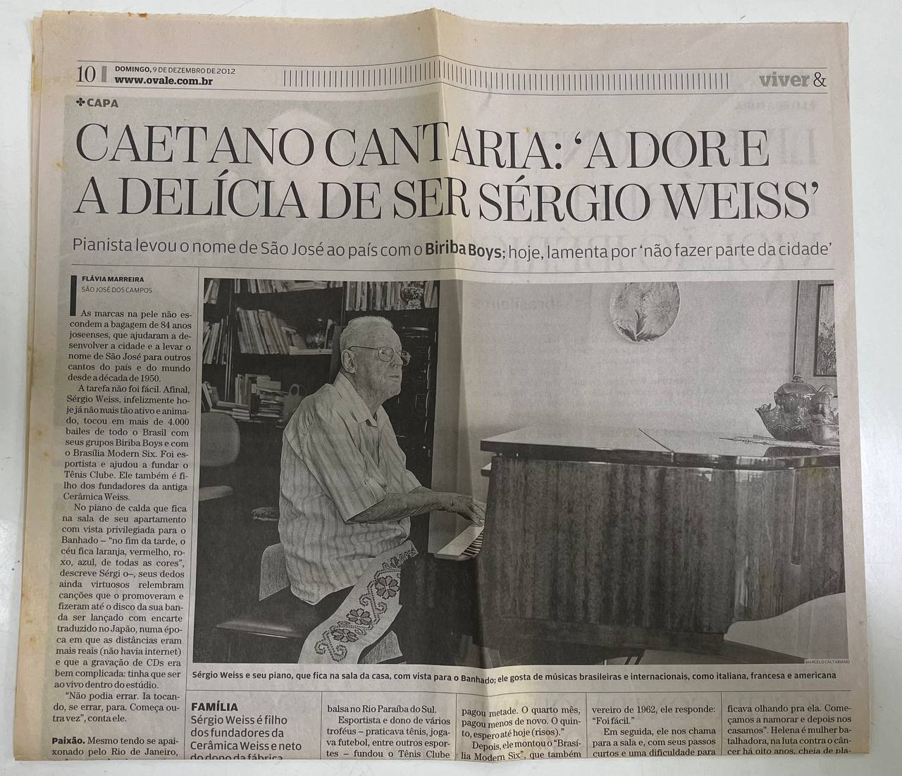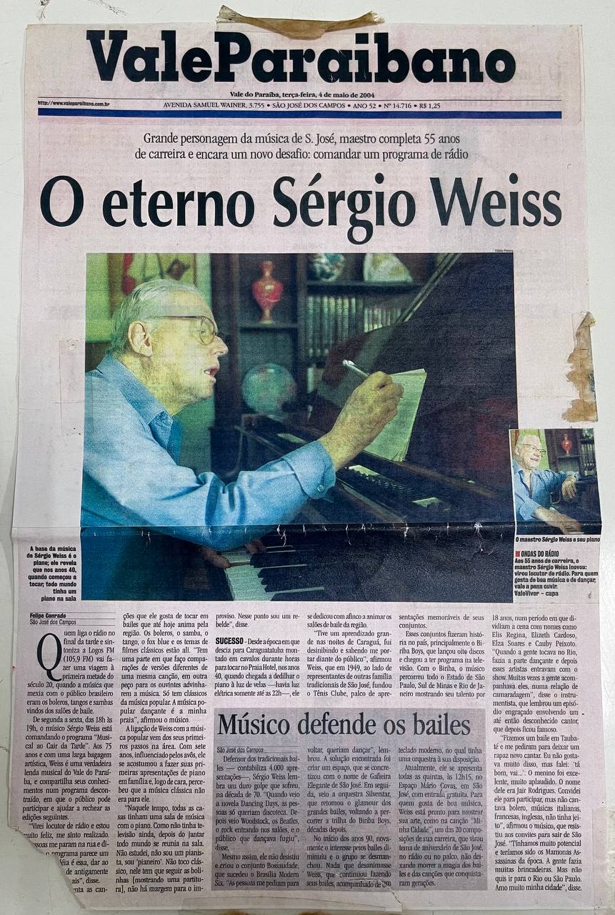 Sérgio Weiss, 84, músico e esportista, ajudou a divulgar São José dos Campos pelo Brasil com os grupos Biriba Boys e Brasília Modern Six, tocando em mais de 4 mil bailes. Fundador do Tênis Clube e autor do hino oficial da cidade, mantém viva a memória local. Apesar do orgulho do passado, sente-se esquecido. Vive hoje com sua esposa Helena, relembrando sua trajetória com saudade, paixão por São José e um pouco de tristeza.