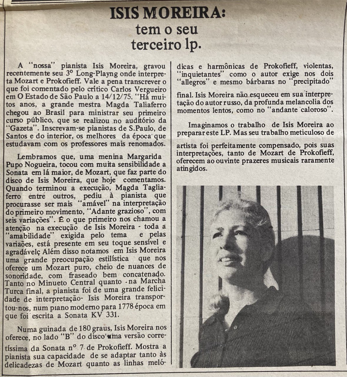 A pianista Isis Moreira lançou seu 13º LP com interpretações de Mozart e Prokofieff. O crítico Carlos Vergueiro destacou sua sensibilidade e estilo refinado, ressaltando a amabilidade presente no "Andante grazioso" da Sonata KV 331. No lado B, Isis demonstra versatilidade ao interpretar a Sonata nº 7 de Prokofieff com intensidade e melancolia. Seu trabalho meticuloso resulta em interpretações de rara qualidade musical.