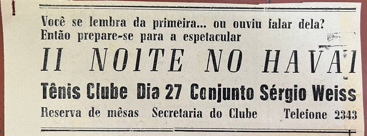 Uma das maiores conquistas do setor artístico Joséense acaba de ser dada a público pelo Departamento de Relações Públicas dos Conjuntos Biriba Boys e Sérgio Weiss, desta cidade. Ambos os conjuntos estarão animando bailes que se realizarão na cidade mineira de Uberaba, no próximo mês de maio. Biriba Boys tocará no Tênis Clube daquela cidade, dias 6 e 8 de maio.