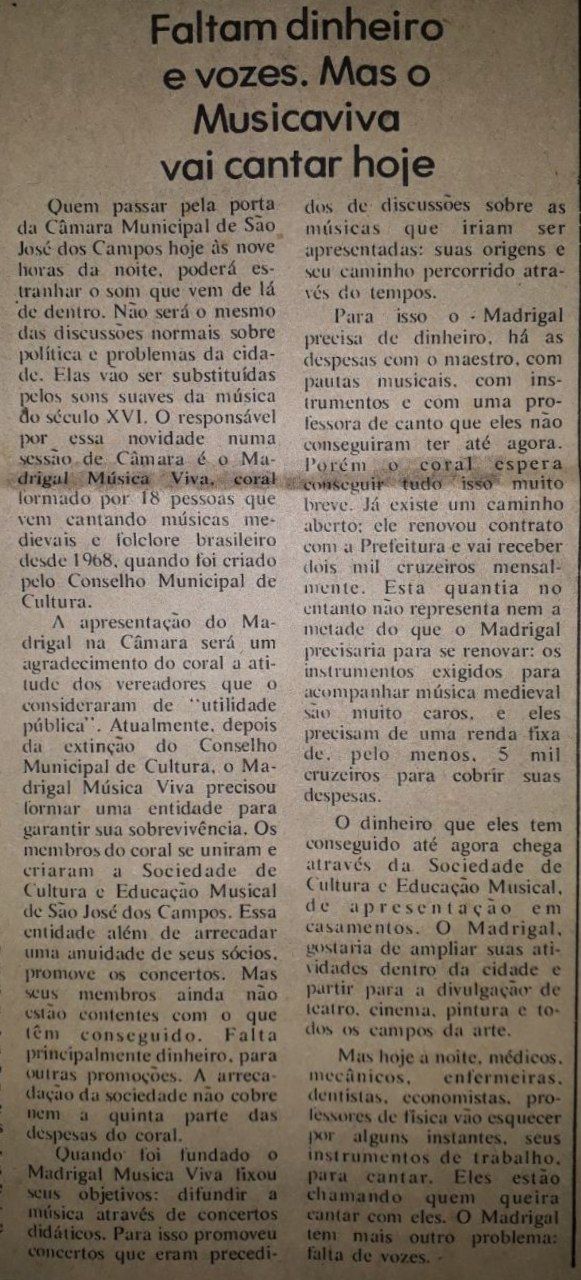 Apresentação do coral Madrigal Música Viva. O repertório inclui música do século XVI. Na Câmara Municipal de São José dos Campos. Data 24 de Outubro de 1976. A apresentação é um agradecimento aos vereadores por terem declarado o coral como de "utilidade pública". Apesar de dificuldades financeiras ("Faltam dinheiro"), o coral, fundado em 1968, continua ativo e agora é mantido pela recém-criada "Sociedade de Cultura e Educação Musical de São José dos Campos" para garantir sua sobrevivência.