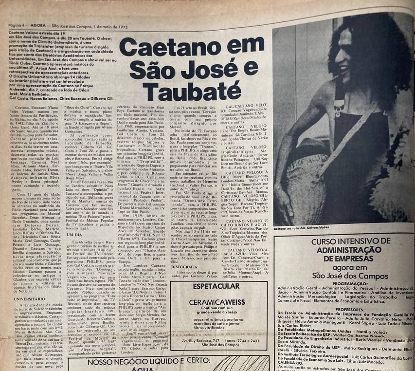 Show da turnê "Circuito Universitário", do cantor Caetano Veloso. São José dos Campos: Dia 19 de Maio de 1973, no Tênis Clube, e na cidade de Taubaté: Dia 20 de Maio de 1973.