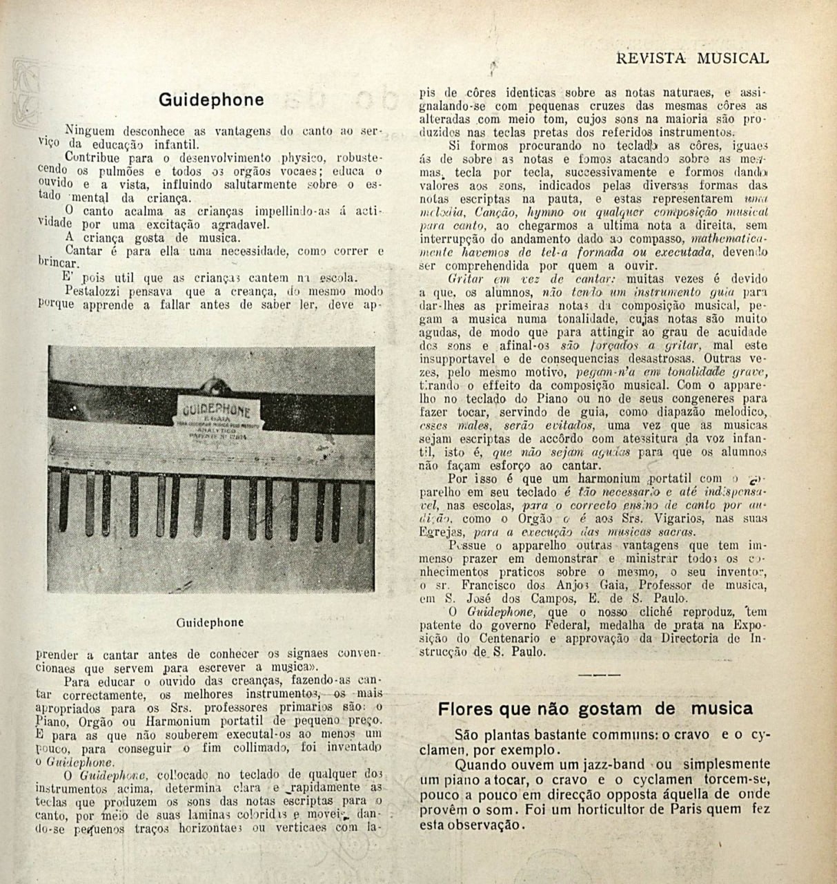 O Guidephone, collocado no teclado de qualquer dos instrumentos acima, determina clara e rapidamente as teclas que produzem os sons das notas escriptas para o canto.
