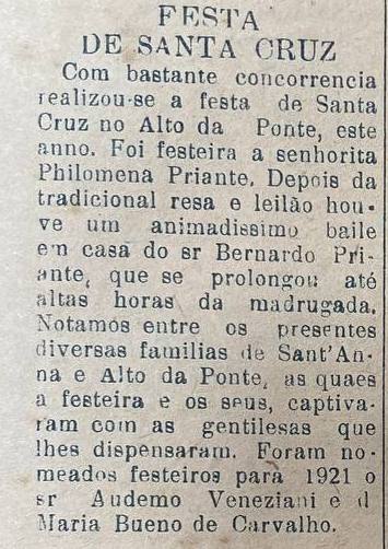 Com bastante concorrencia realizou-se a festa de Santa Cruz no Alto da Ponte, este anno. Foi festeira a senhorita Philomena Priante. Depois da tradicional resa e leilão houve um animadissimo baile em casa do sr Bernardo Priante, que se prolongou até altas horas da madrugada. Notamos entre os presentes diversas familias de Sant'Anna e Alto da Ponte, as quaes a festeira e os seus, captivaram com as gentilesas que lhes dispensaram. Foram nomeados festeiros para 1921 ο sr Audemo Veneziani e d Maria Bueno de Carvalho.