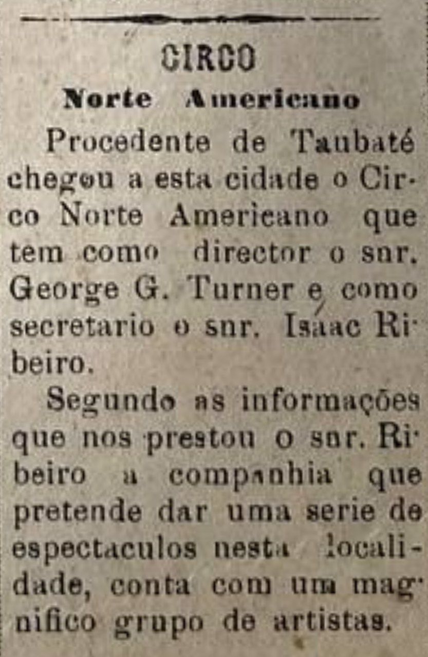 Procedente de Taubaté chegou a esta cidade o Circo Norte Americano que tem como director o snr. George G. Turner e como secretario o snr. Isaac Ri beiro. Segundo as informações que nos prestou o snr. Ribeiro a companhia que pretende dar uma serie de espectaculos nesta localidade, conta com um magnifico grupo de artistas.
