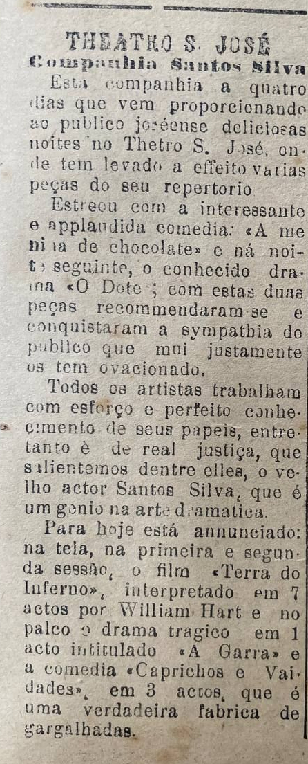 Esta companhia a quatro dias que vem proporcionando ao publico joséense deliciosas noites no Thetro São José, onde tem levado a effeito varias peças do seu repertorio. Estreou com a interessante e applaudida comedia: A menina de chocolate e ná noite seguinte, o conhecido dra O Dote; com estas duas peças recommendaram se e conquistaram a sympathia do publico que mui justamente os tem ovacionado.