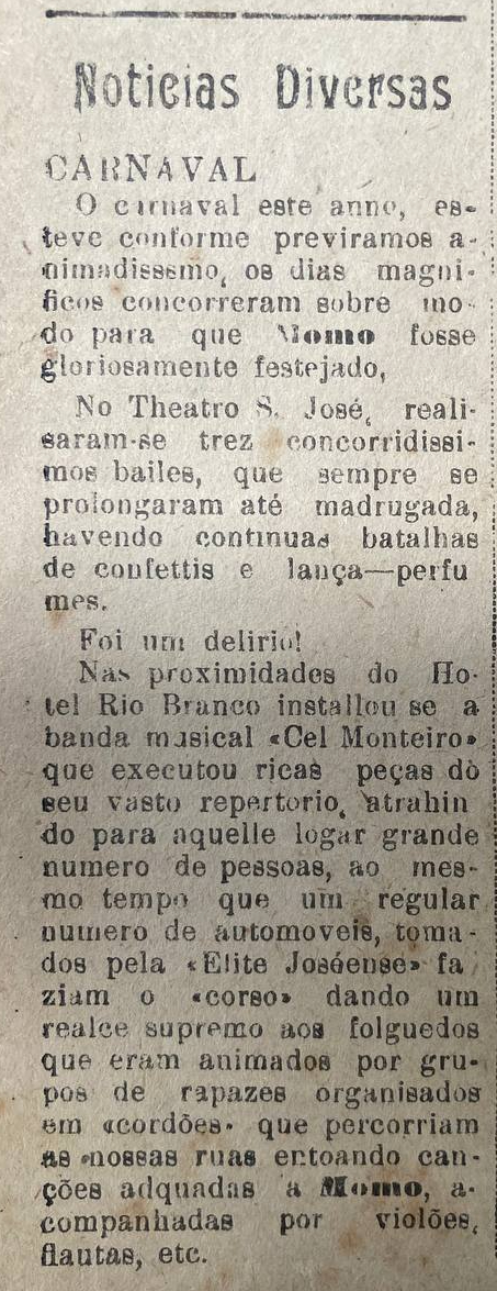O carnaval este anno, esteve conforme previramos animadissemo, os dias magnificos concorreram sobre modo para que Momo fosse gloriosamente festejado. No Theatro São José, realisaram-se trez concorridissimos bailes, que sempre se prolongaram até madrugada, havendo continuas batalhas de confetes e lança-perfumes. Nas proximidades do Hotel Rio Branco installou se a banda musical Coronel Monteiro que executou ricas peças do seu vasto repertorio.