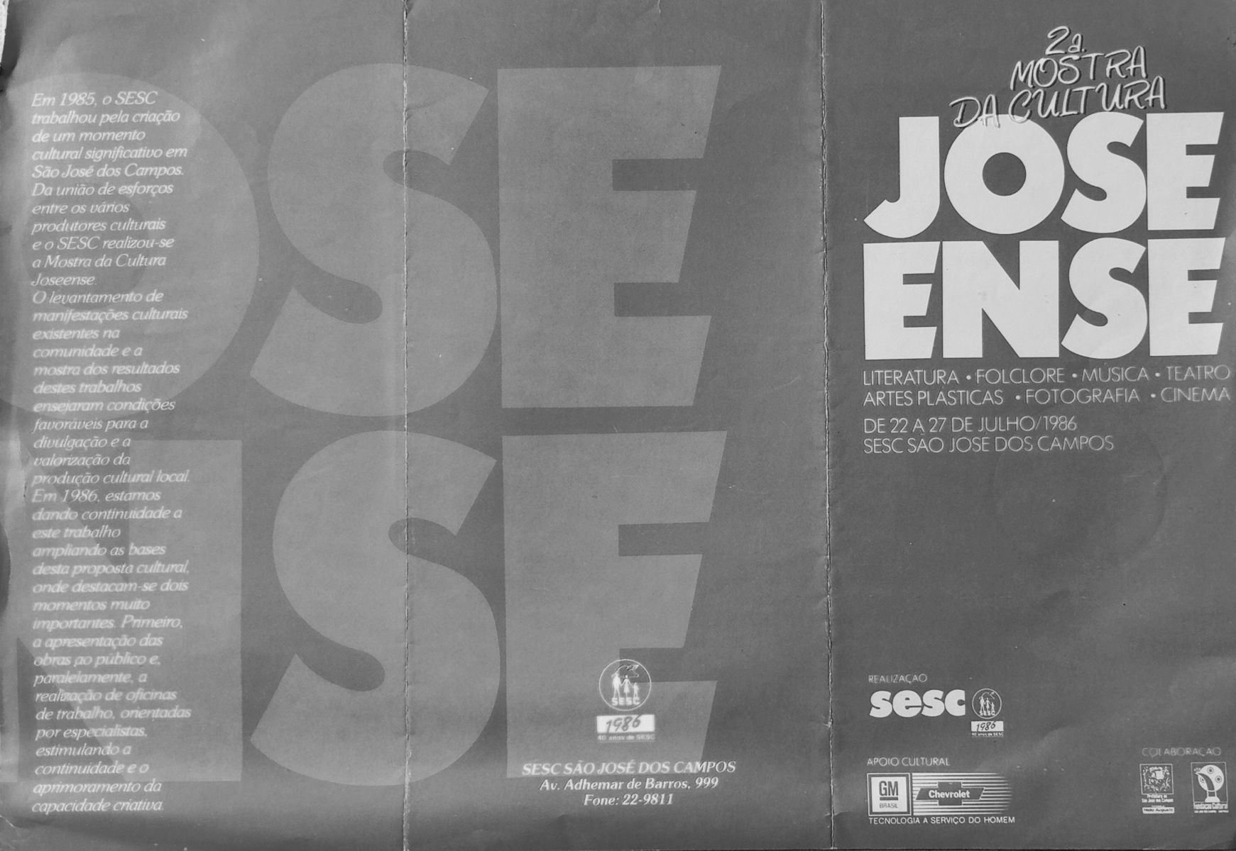 A 2ª Mostra da Cultura Joséense aconteceu de 22 a 27 de julho de 1986 no SESC São José dos Campos, com apresentações de música popular, erudita, rock, forró, folclore e corais, além de oficinas culturais. Participaram artistas como Ernesto Vilela, Medeiros e Medeirinhos, Lyga Kullack, Sérgio C. Oliveira e o Grupo Gaya. O evento destacou a produção cultural local e incentivou a criatividade da comunidade.