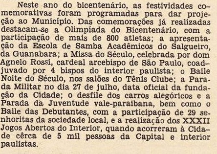 Das comemorações já realizadas destacam-se a Olimpíada do Bicentenário; a apresentação da Escola de Samba Acadêmicos do Salgueiro, da Guanabara; a Missa do Século, celebrada pelo cardeal arcebispo de São Paulo; o Baile Noite do Século, nos salões do Tênis Clube; a Parada Militar no dia 27 de julho; o desfile dos carros alegóricos e a Parada da Juventude valeparaibana, bem como o Baile das Debutante e a realização dos XXXII Jogos Abertos do Interior.