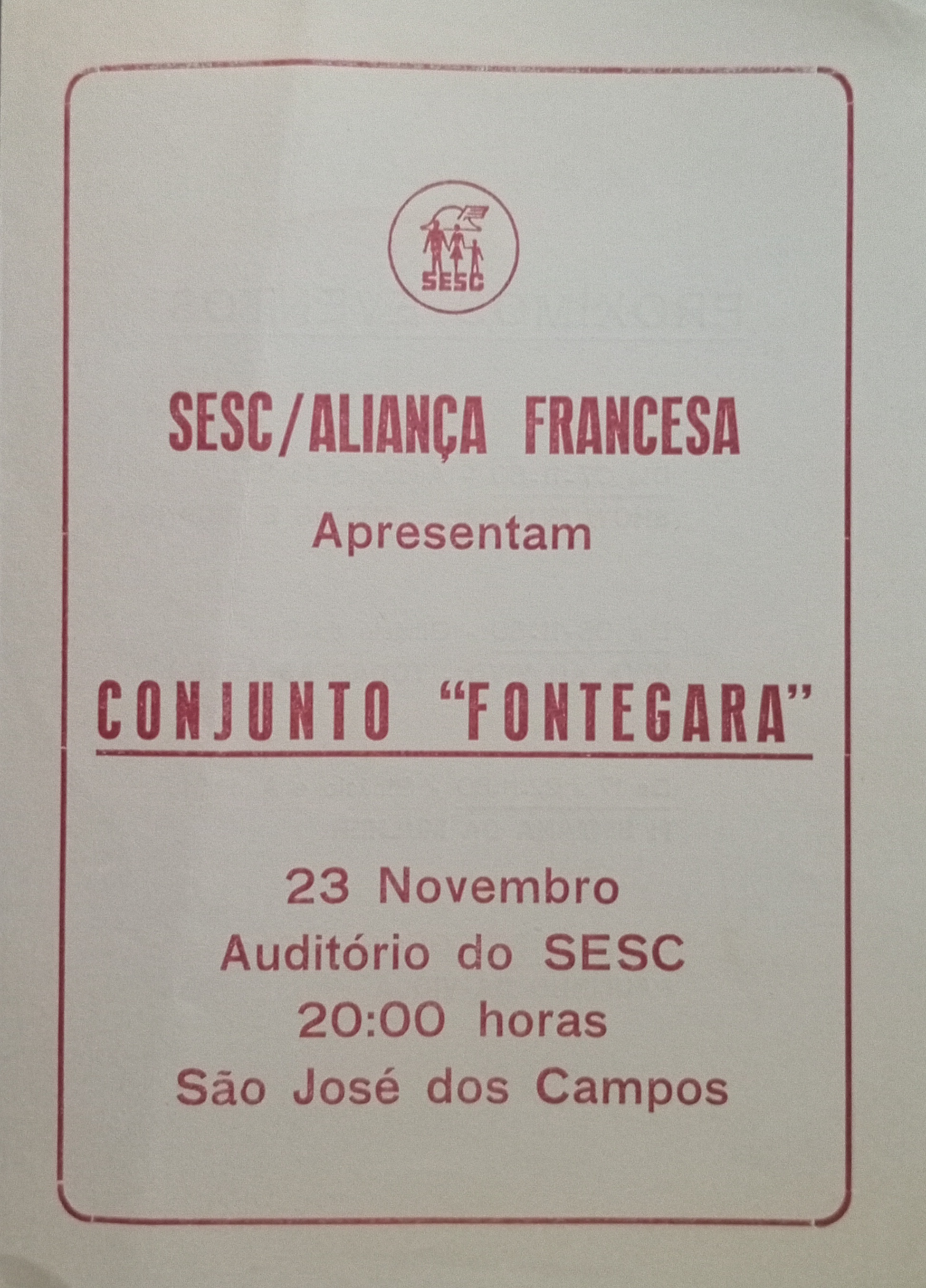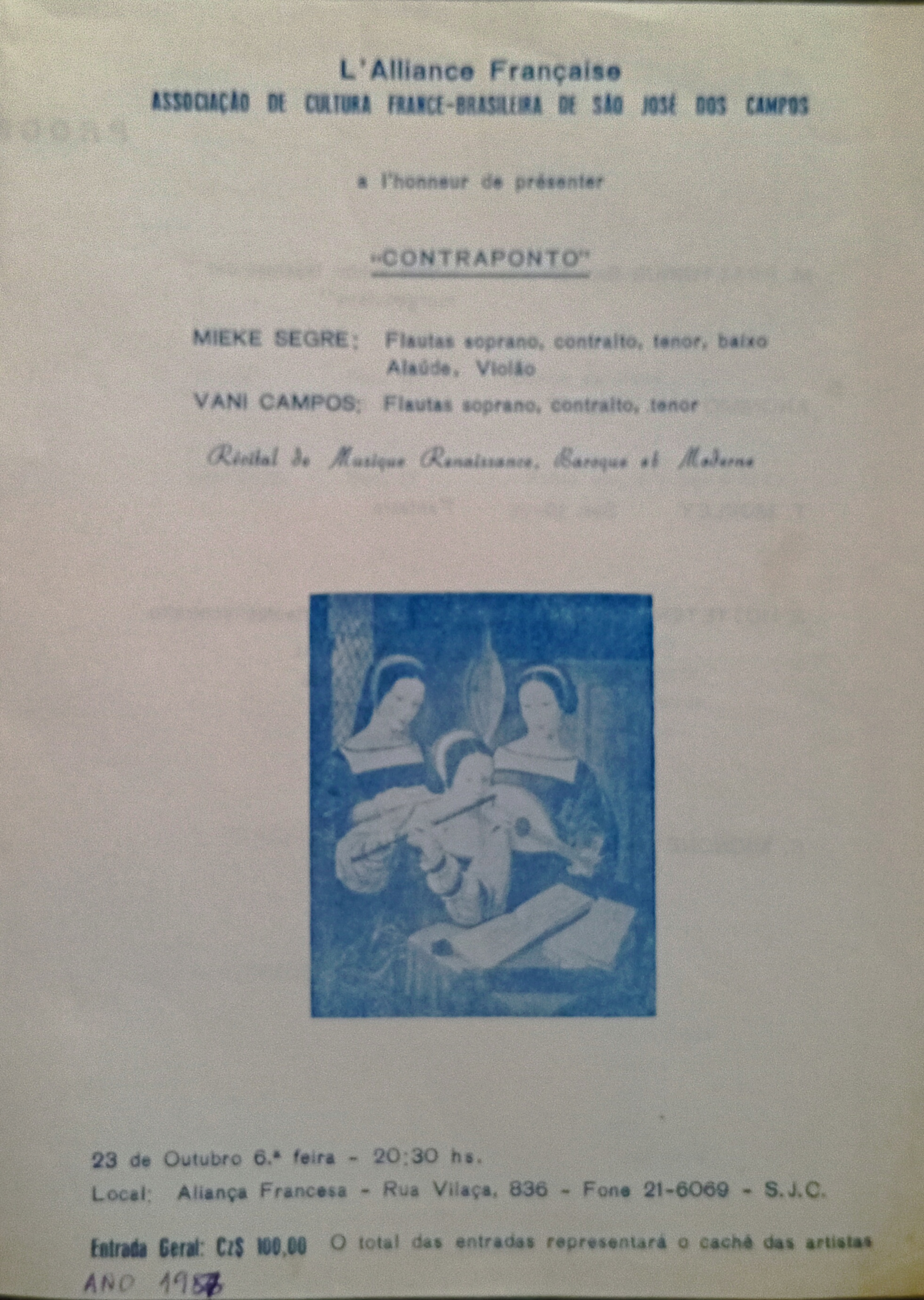A Aliança Francesa de São José dos Campos apresenta o recital "Contraponto" com Mieke Segre (flautas, alaúde e violão) e Vani Campos (flautas), interpretando músicas dos períodos renascentista, barroco e moderno. O evento será no dia 23 de outubro de 1987, sexta-feira, às 20h30, na sede da Aliança Francesa, Rua Vilaça, 836.