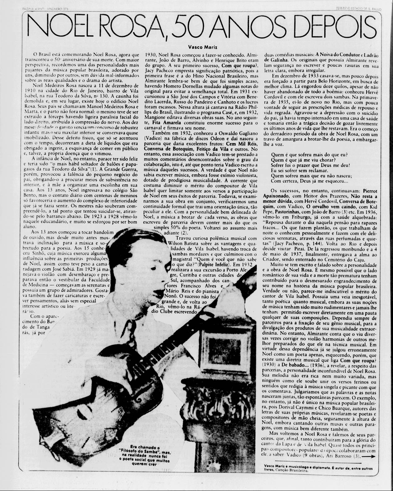 O Brasil está comemorando Noel Rosa, agora que transcorreu o 50º aniversário de sua morte. Com maior perspectiva, recordemos uma das personalidades mais pujantes da música popular brasileira, adorado por uns, diminuído por outros, sem dúvida mal informados sobre as reais qualidades e o drama do artista. Em 1931 excursionou a São José dos Campos e Vitória com Benedito Lacerda, Russo do Pandeiro e Canhoto.
