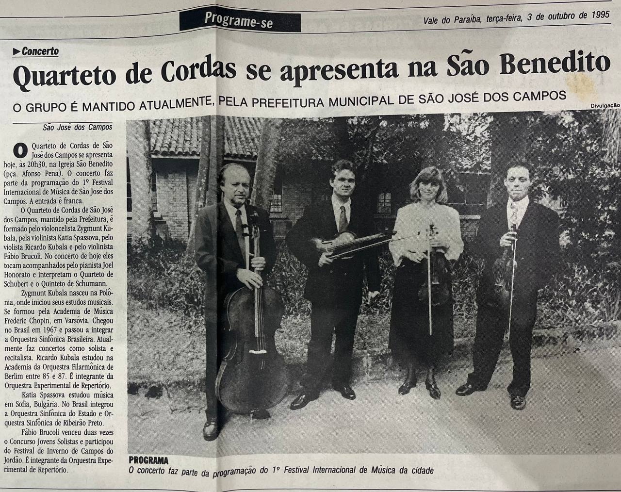 Em 1995, o Quarteto de Cordas de São José dos Campos realizou um concerto gratuito na Igreja São Benedito, como parte da programação do 1º Festival Internacional de Música da cidade.