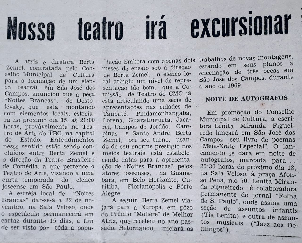 A peça Noites Brancas, dirigida por Berta Zemel com elenco local, estreia em 15/11 no Teatro de Arte do TBC, SP, e em 22/11 na Sala Veloso, em São José dos Campos. Após temporada de 15 dias, o grupo fará turnê por cidades do interior e capitais do Sul e Sudeste. Berta viaja depois à Europa pelo Prêmio Molière. Também no dia 13/11, Lenita Miranda Figueiredo lança o livro Meia-Noite Especial na Sala Veloso, em noite de autógrafos.