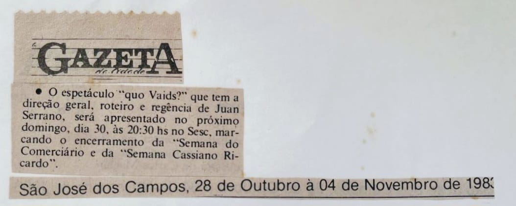O espetáculo "quo Vaids?" que tem a direção geral, roteiro e regência de Juan Serrano, será apresentado no próximo domingo, dia 30, às 20:30 hs no Sesc, marcando o encerramento da "Semana do Comerciário e da "Semana Cassiano Ricardo".