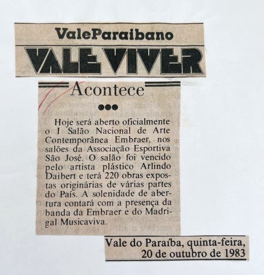 Hoje será aberto oficialmente o I Salão Nacional de Arte Contemporânea Embraer, nos salões da Associação Esportiva São José. O salão foi vencido pelo artista plástico Arlindo Daibert e terá 220 obras expostas originárias de várias partes do País. A solenidade de abertura contará com a presença da banda da Embraer e do Madrigal Musicaviva.