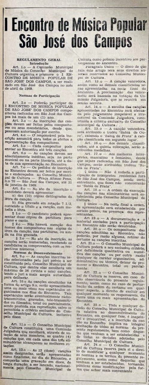 O I Encontro de Música Popular de São José dos Campos, promovido pelo Conselho Municipal de Cultura, acontece em abril de 1969 e é aberto a compositores residentes há mais de um ano na cidade. As canções devem ser inéditas e passam por seleção. As finalistas são apresentadas ao público, gravadas em disco e premiadas com troféus e medalhas. As decisões do júri são irrecorríveis e o material inscrito não é devolvido.