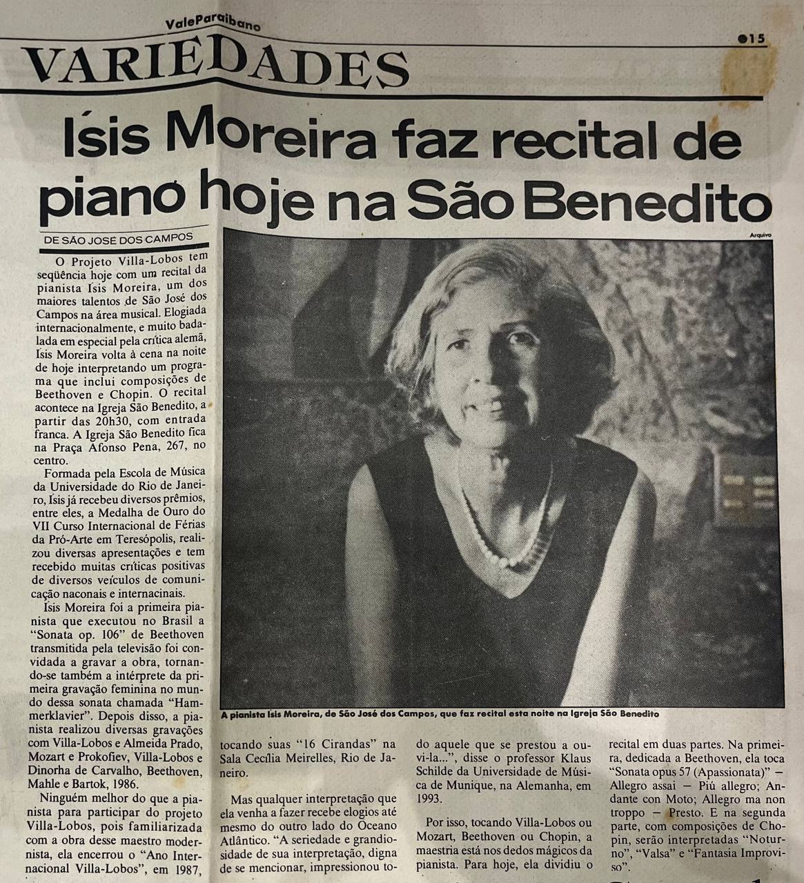 Em 1994, a renomada pianista joseense Ísis Moreira realizou um recital de piano gratuito na Igreja São Benedito, como parte do "Projeto Villa-Lobos".Ísis apresentou um programa dividido em duas partes, com obras de Ludwig van Beethoven e Frédéric Chopin.O repertório destacou a Sonata "Apassionata" de Beethoven na primeira parte e composições famosas de Chopin, como "Noturno" e "Fantasia Improviso", na segunda.