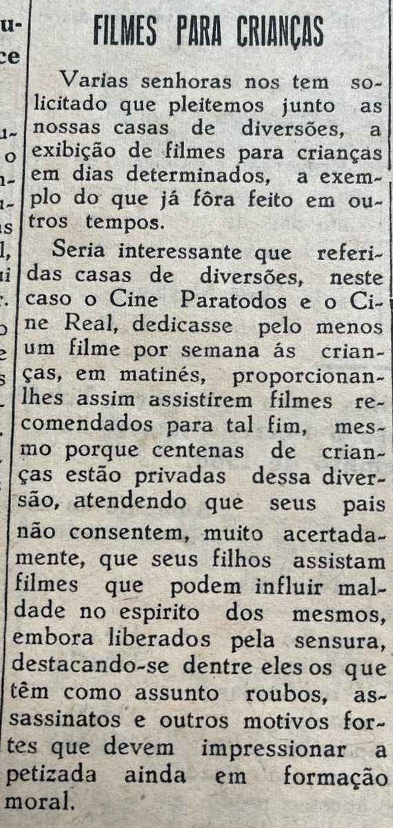 Um grupo de senhoras está pedindo aos cinemas Paratodos e Real que voltem a exibir filmes infantis, uma prática que existia antigamente. A sugestão é que seja dedicada pelo menos uma sessão de matinê por semana para as crianças, com programação adequada à sua idade. O apelo se baseia na preocupação dos pais com filmes de conteúdo violento, que podem prejudicar a formação moral dos filhos.