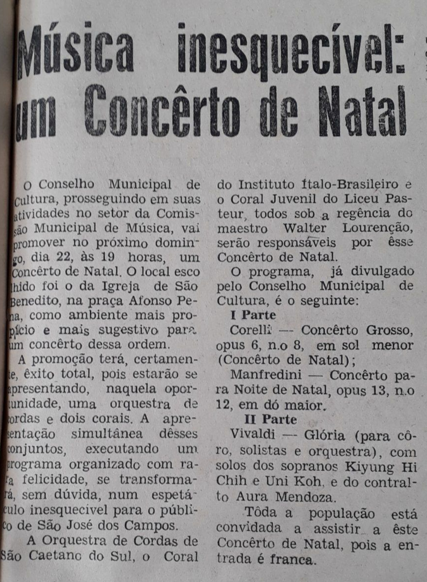 O Conselho Municipal de Cultura promove um Concerto de Natal no próximo domingo, dia 22, às 19 horas, na Igreja de São Benedito, na praça Afonso Pena. O evento reunirá três renomados conjuntos: a Orquestra de Cordas de São Caetano do Sul, o Coral do Instituto Italo-Brasileiro e o Coral Juvenil do Liceu Pasteur. Todos os grupos se apresentarão em um espetáculo único, sob a regência do maestro Walter Lourenção.