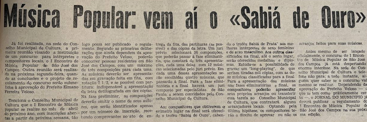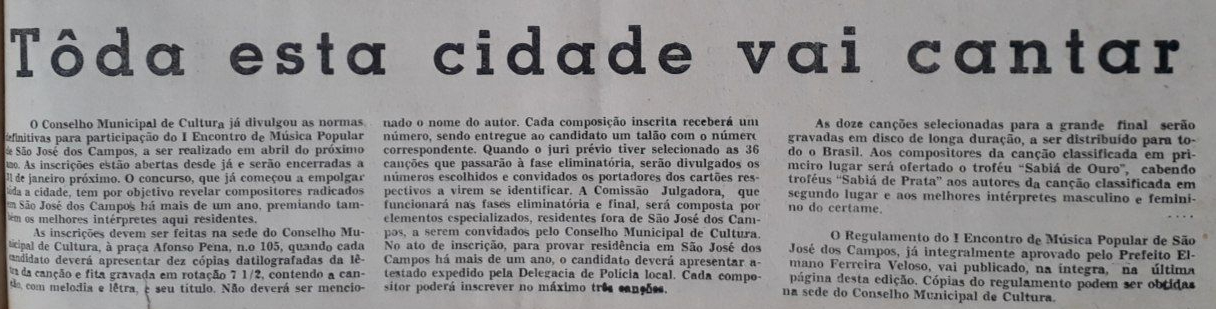 O Conselho Municipal de Cultura divulgou as regras finais e abriu as inscrições para o I Encontro de Música Popular de São José dos Campos. O evento, que acontecerá em abril de 1969, tem como objetivo revelar e premiar compositores e intérpretes que residem na cidade há mais de um ano. As inscrições se encerram em janeiro de 1969 e o regulamento completo, já aprovado pelo prefeito, pode ser obtido na sede do Conselho.