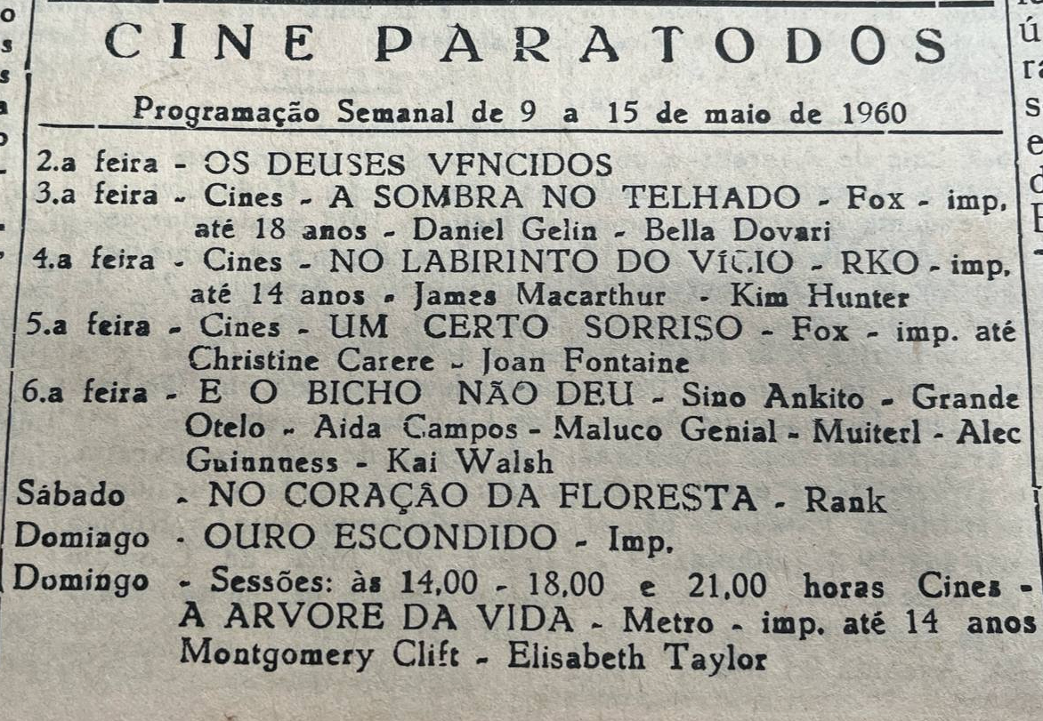 O Cine Paratodos divulga sua programação de 9 a 15 de maio de 1960, exibindo um filme por dia, como "Os Deuses Vencidos" e "Um Certo Sorriso". Os destaques da semana são a comédia nacional "E o Bicho Não Deu" com Ankito e Grande Otelo na sexta-feira, e o clássico "A Árvore da Vida" com Elizabeth Taylor no domingo. O domingo terá três sessões especiais, às 14h, 18h e 21h, com a maioria dos filmes da semana possuindo classificação etária.